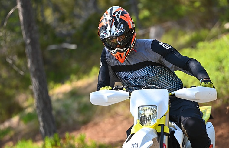 - Equipement Enduro pilote (casque enduro, bottes, gilet pare-pierre, genouillères, t-shirt et pantalon, veste enduro/veste de pluie)